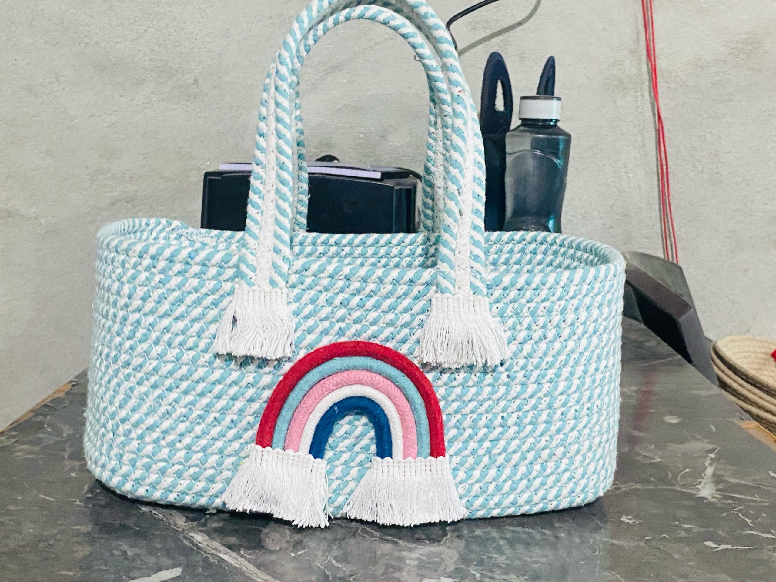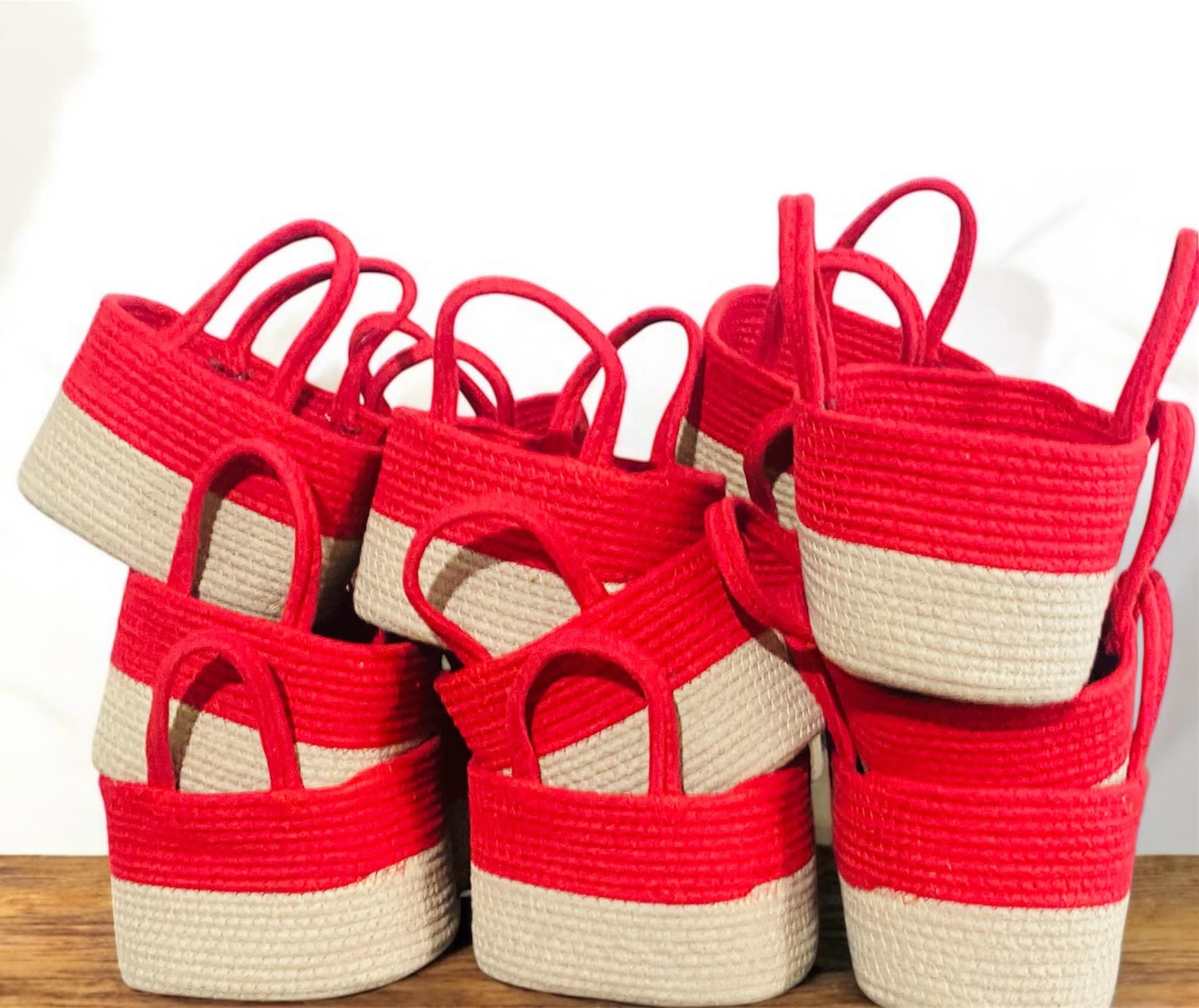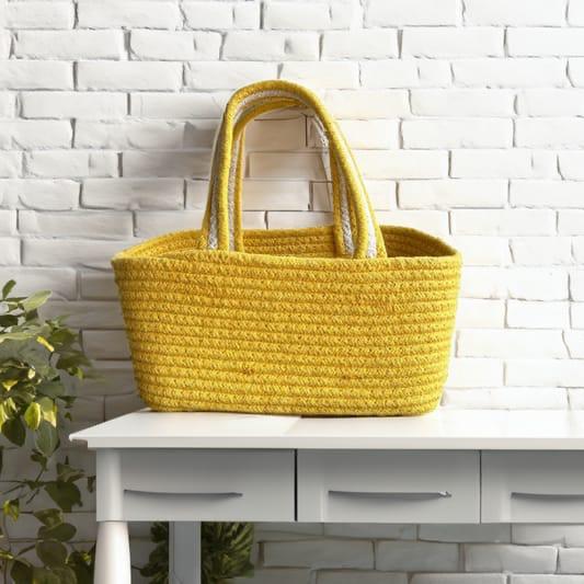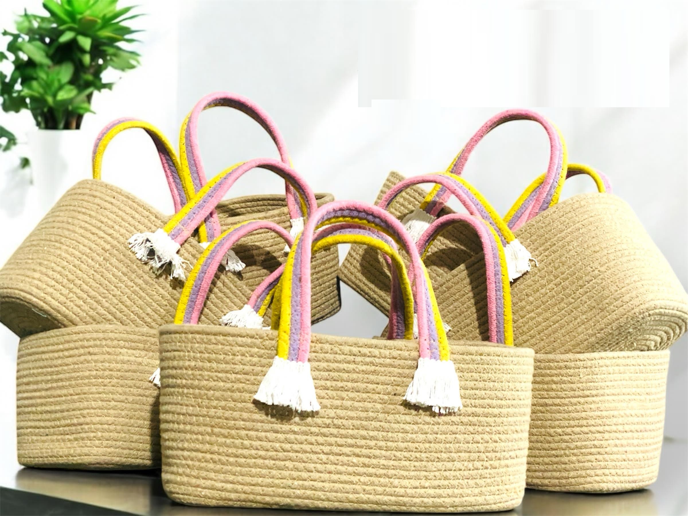 The SunTote Jute Carry Basket is a beautiful blend of rustic charm and vibrant flair. Made from natural jute and enhanced with dual-color cotton handles in pink and yellow, this eco-friendly bag is ideal for daily errands, gift hampers, or festive storage.